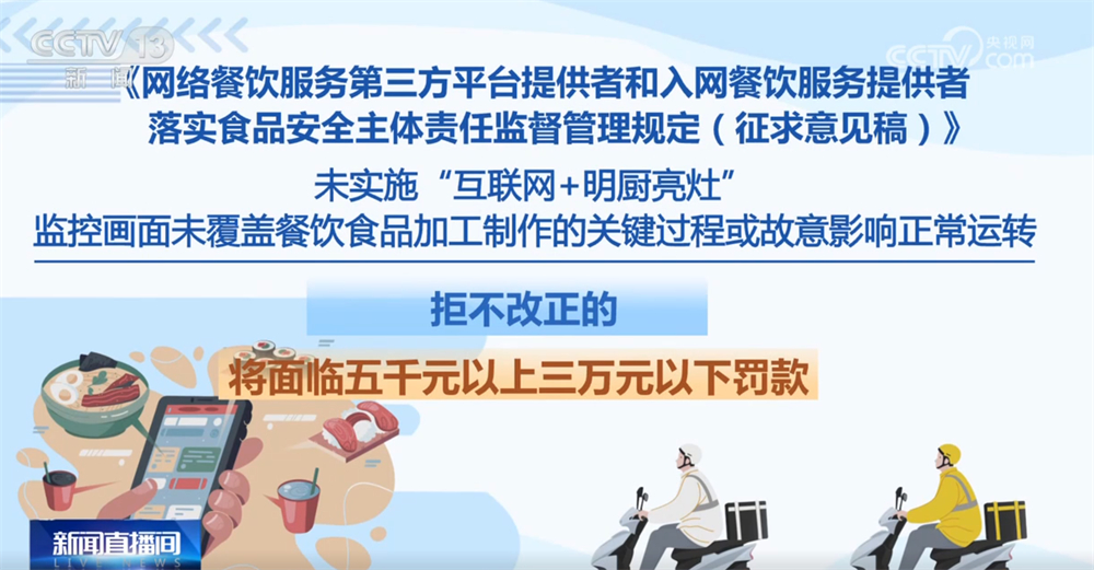 入网餐饮办事供给者该当实施“互联网+明厨亮灶”,画面笼盖餐饮食物加工制做的环节过程,并一般运转。同时,要求不得将订单委托其他餐饮办事供给者加工制做。对餐饮食物进行包拆、封口,并封口后无法回复复兴和便于消费者辨识,防止餐饮食物正在配送过程中遭到污染。