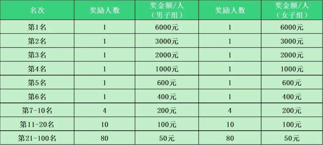 (1)60公里组励男女子各前100名,别离获得如下表所列的金(金需征收20%的小我所得税)货泉单元:人平易近币元。