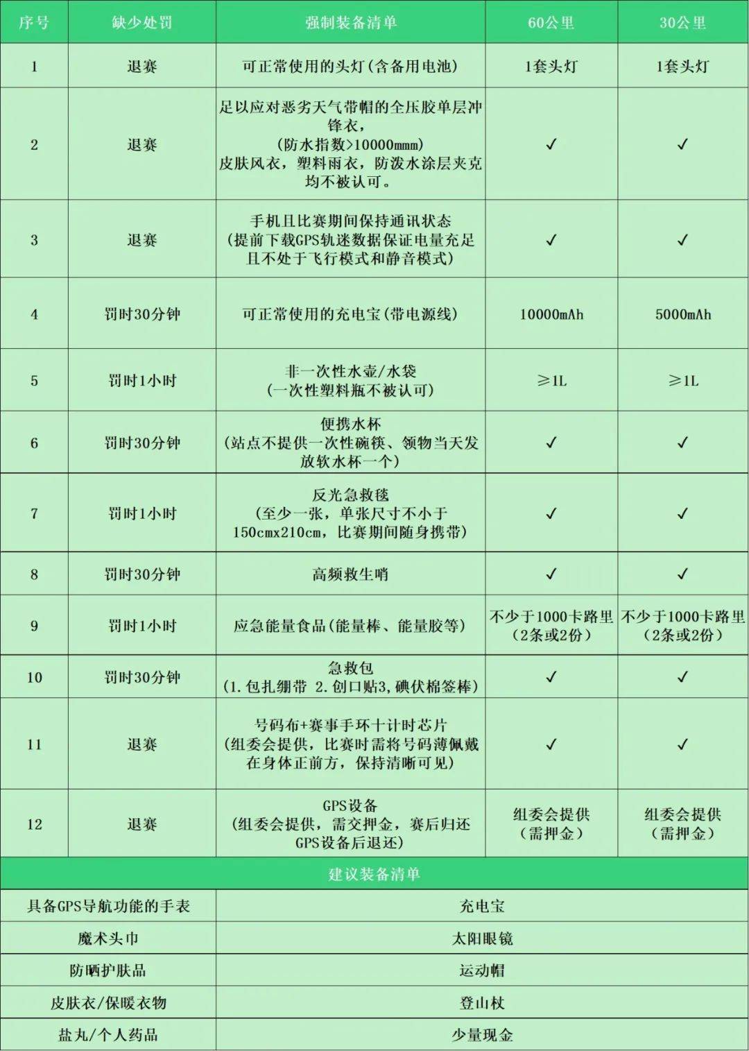 赛事各组别强制配备清单如下(以下强制配备清单为对于参赛者的最低照顾要求,参赛者请尽量选用正在机能上可以或许防风防雨、保暖的衣物以保障本人正在赛道上的生命平安)。